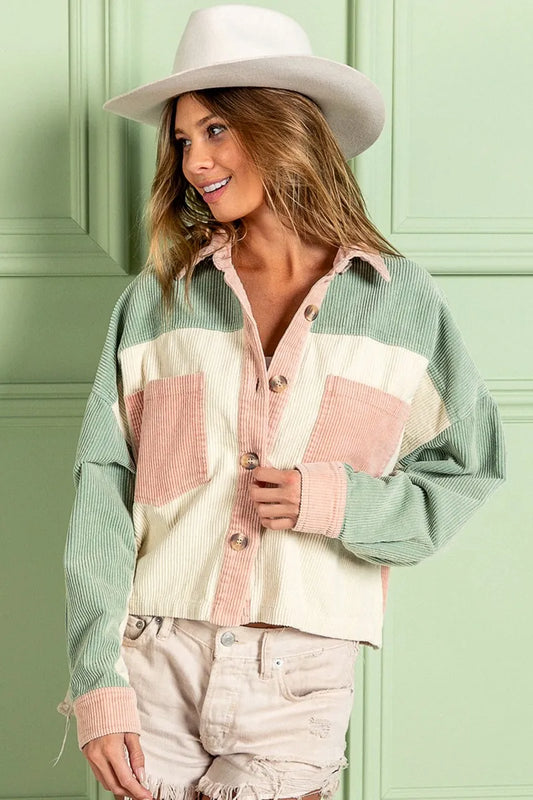 • BiBi Color Block Vintage Washed Corduroy Jacket SAGE IVORY ROSE - Fashorio