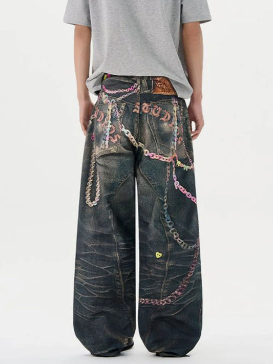 • Men's Printed Washed Distressed Wide Leg Jeans Blue - Fashorio