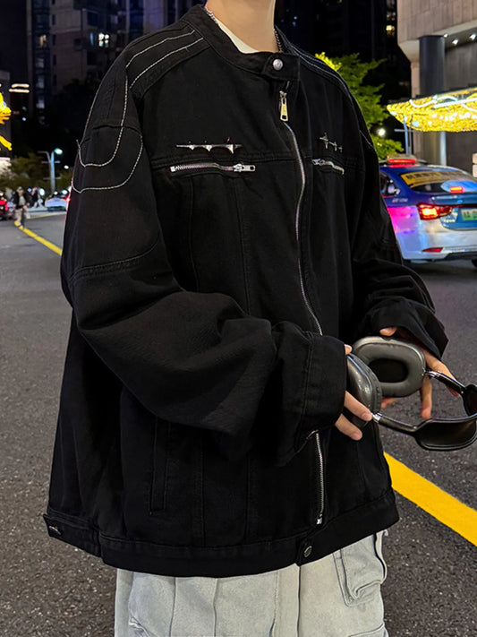 • Men's Plus Size Zip Up Long Sleeve Denim Jacket Black - Fashorio