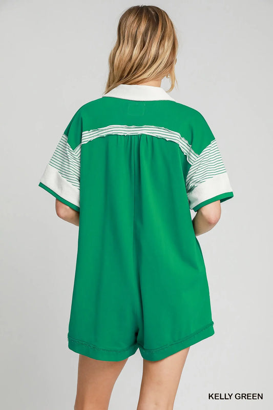 • Umgee French Terry Collared Colorblock Romper KELLY GREEN - Fashorio