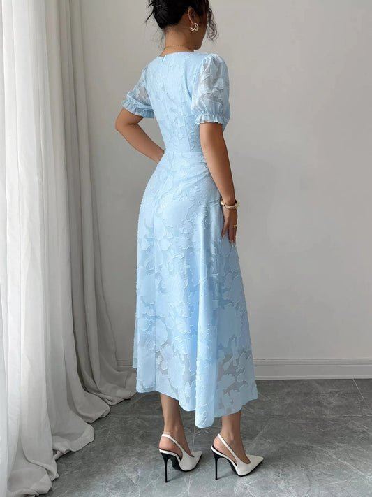 • Floral Puff Sleeve Square Neck Midi Dress Light Blue - Fashorio