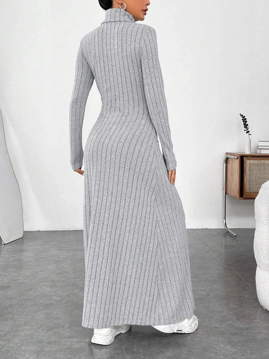 • Ribbed Turtleneck Long Sleeve Maxi Knit Dress Gray - Fashorio